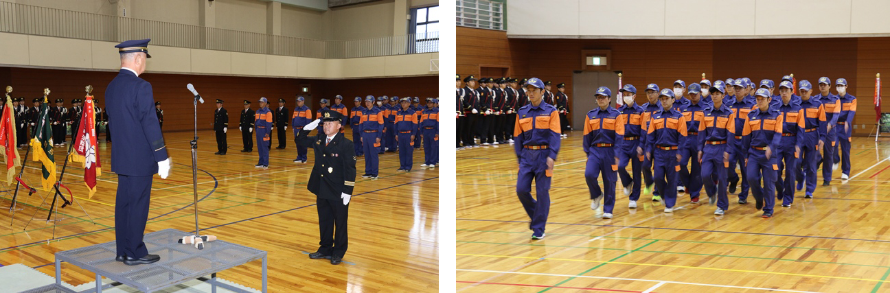 当日は、姿勢服装点検や小隊訓練、ラッパ吹奏、分列行進などを行い、地域の安全・安心を守るため、団員の士気高揚を図るとともに、火災が多発する季節に向け、万全の体制を整えることができました。