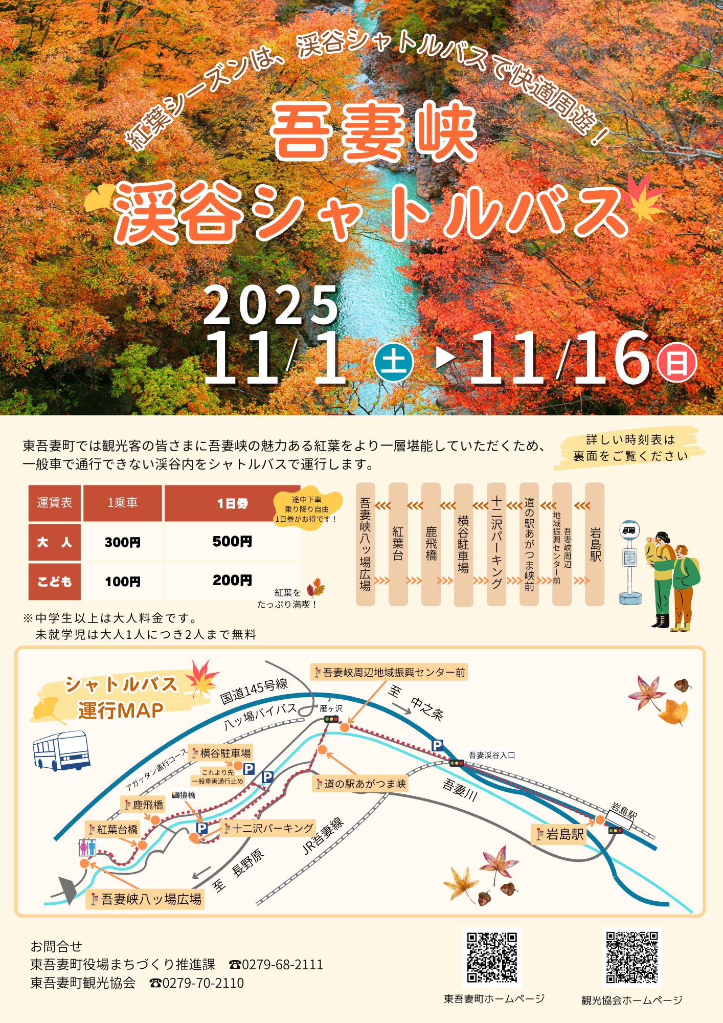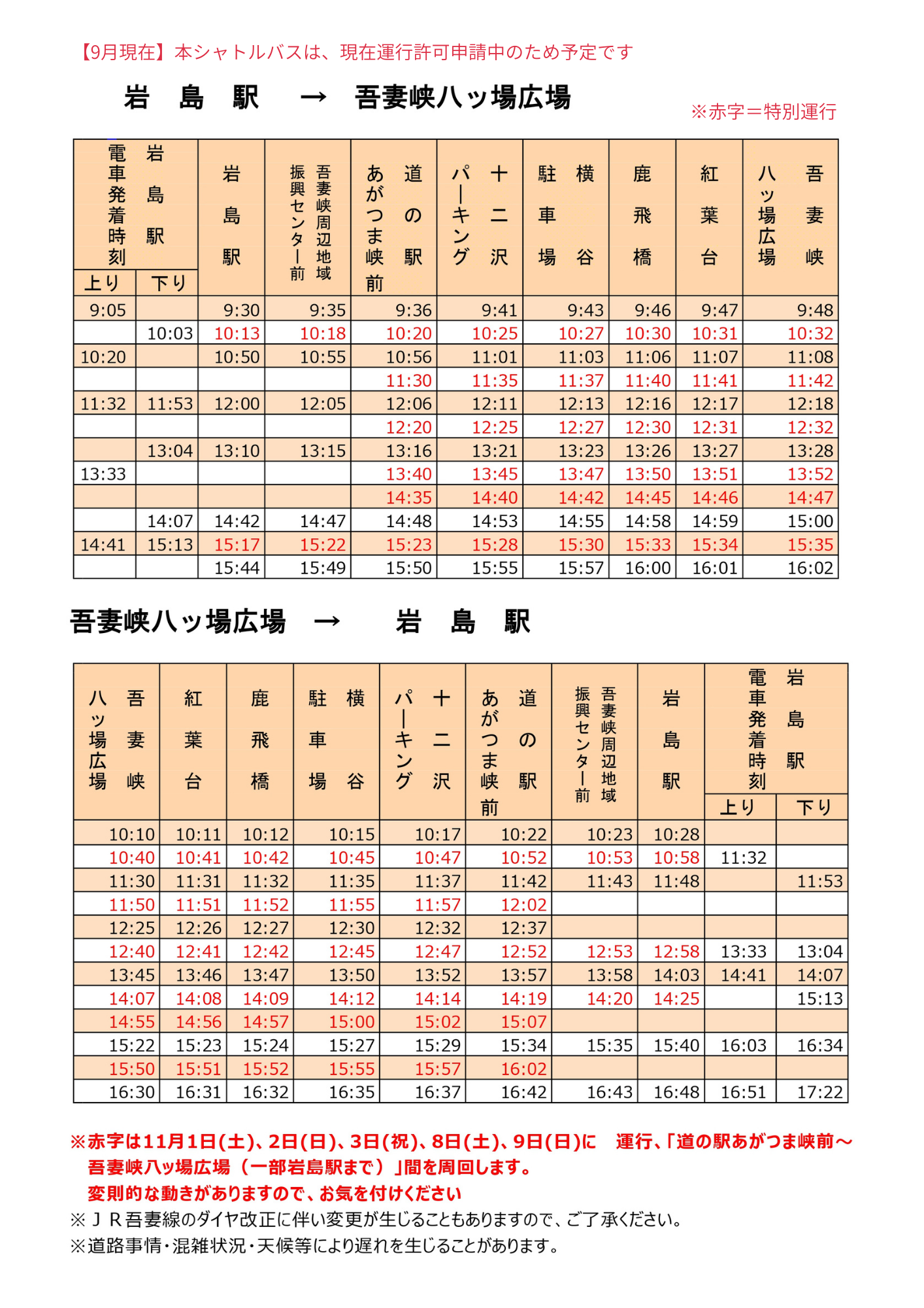 ※11月1日(土)・2日(日)・3日(祝)・8日(土)・9日(日)は、道の駅あがつま峡 ⇔ 吾妻峡八ッ場広場の特別運行もあります。