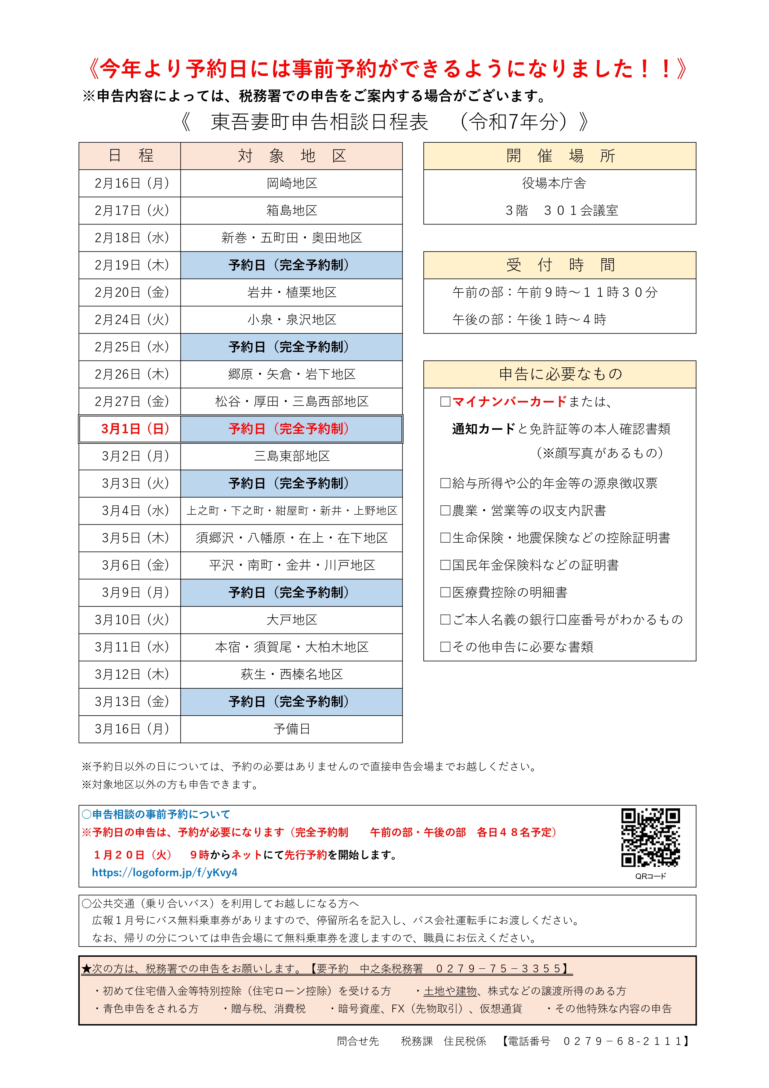 予約日以外の日に申告をされる方は、直接申告会場(東吾妻役場)へご来場ください。当日会場で順番に案内を行います。