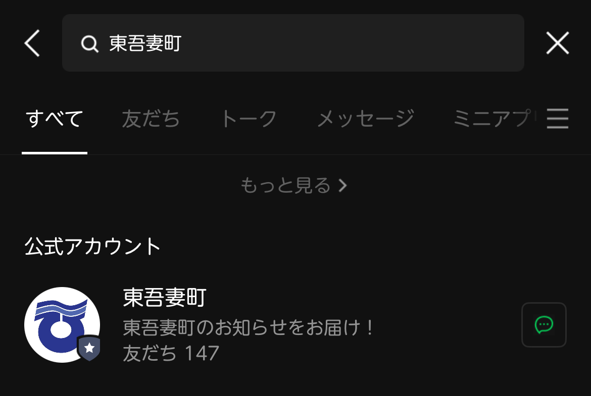 LINEアプリを起動し、ID検索から「@higashiagatsuma」と入力していただくか、ホーム画面の検索バーから「東吾妻町」と検索してください。