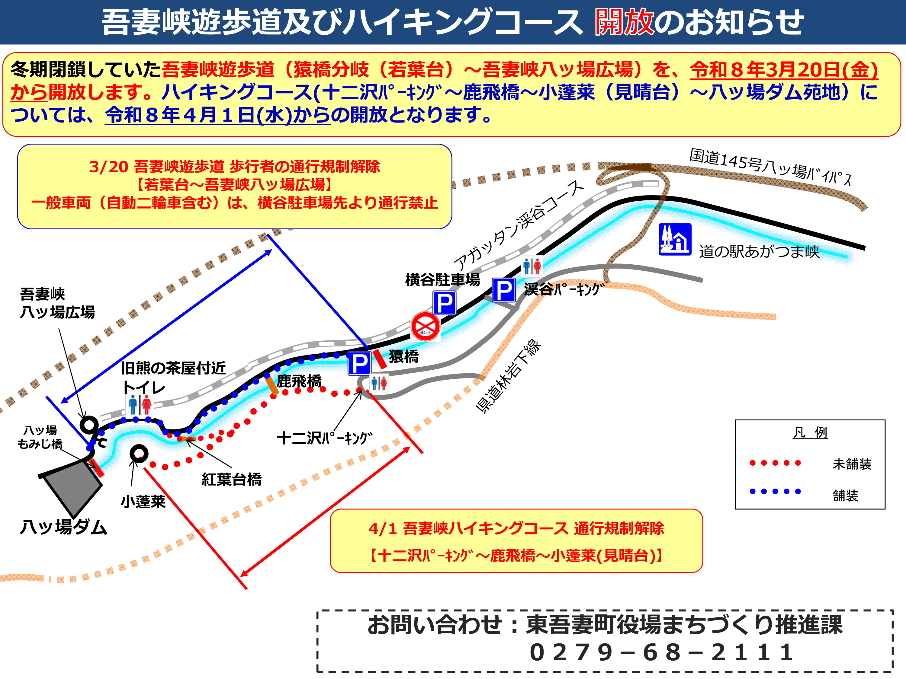 冬期閉鎖していた『吾妻峡遊歩道(猿橋分岐(若葉台)~吾妻峡八ッ場広場)及びハイキングコース(十二沢パーキング~鹿飛橋~小蓬莱(見晴台)』の間を開放します。